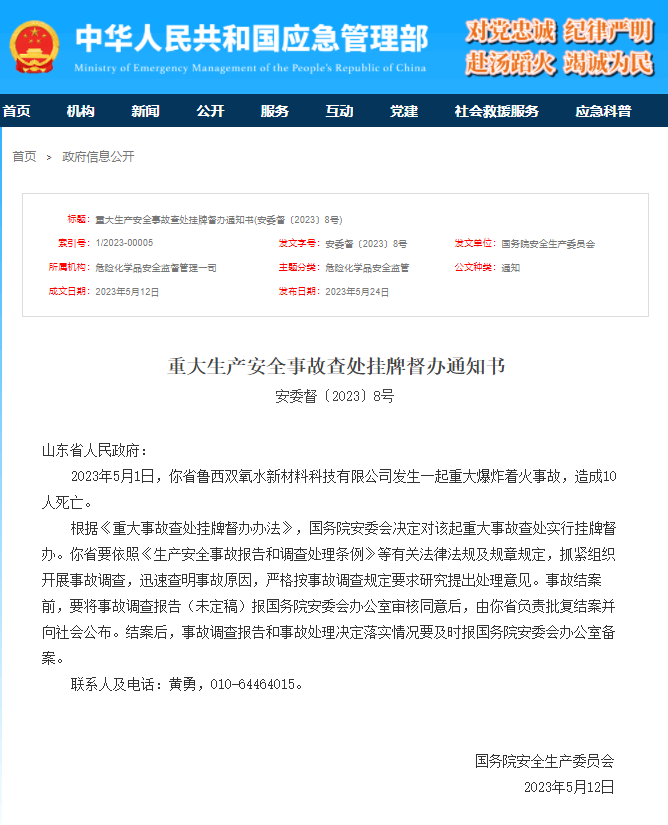 據(jù)應(yīng)急管理部消息,5月24日,國務(wù)院安全生產(chǎn)委員會發(fā)布重大生產(chǎn)安全事故查處掛牌督辦通知書。