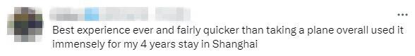 有網(wǎng)友介紹說(shuō),“最好的體驗(yàn),比坐飛機(jī)要快得多,我在上海呆了4年,坐過(guò)很多次。”