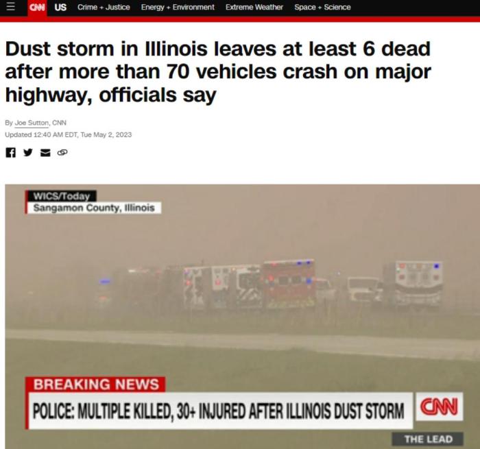中新網5月2日電 綜合美媒消息,當?shù)貢r間5月1日,由于沙塵暴導致能見度降低,70余輛汽車在美國伊利諾伊州55號州際公路蒙哥馬利縣法默斯維爾鎮(zhèn)附近路段相撞,事故已造成至少6人死亡,37人受傷入院。