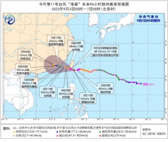 9月3日08時(shí)至4日08時(shí),受“??庇绊?,巴士海峽、臺(tái)灣海峽、臺(tái)灣以東洋面、東海南部及釣魚島附近海域以及浙江南部沿海、福建沿海、臺(tái)灣島沿海將有6-8級、陣風(fēng)9-10級大風(fēng),部分海域或地區(qū)的風(fēng)力有9-12級,陣風(fēng)13-14級,“??敝行慕?jīng)過的附近海面或地區(qū)的風(fēng)力有13-16級,陣風(fēng)17級。