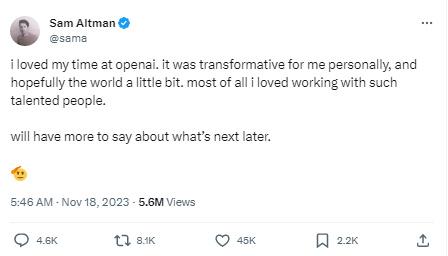 當(dāng)?shù)貢r(shí)間18日,奧特曼在社交平臺(tái)表示,“我很喜歡OpenAI的時(shí)光,這對(duì)我個(gè)人來說是變革性的,也希望通過重塑世界帶來一些變革。最重要的是,我喜歡與這些才華橫溢的人一起工作?!?/p>
