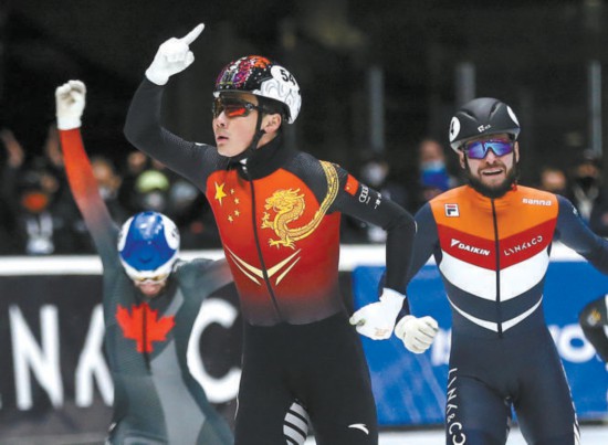 任子威(中)本賽季狀態(tài)出色,發(fā)揮穩(wěn)定,這是他在去年11月底進(jìn)行的短道速滑世界杯多德雷赫特站比賽中奪得男子1500米冠軍后霸氣慶祝。 新華社供圖
