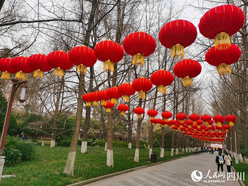 公園的大門布置成了喜慶的大紅色,門上門旁掛滿了紅燈籠。一串四個紅燈,既可以理解為“四季平安”,也可以理解為“四季發(fā)財”,還可以理解成“四平八穩(wěn)”……中國文化的詩意內(nèi)涵,可以激發(fā)出人們更多的想象力。