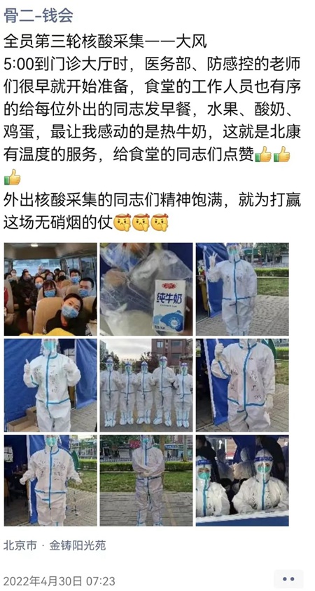 4月30日是五一小長假第一天,晚7點,宣武醫(yī)院神經(jīng)內科電生理專業(yè)組工作群的消息突然響了,組長黃朝陽發(fā)布了一條信息:“5月1日和3日各需5人支援西城核酸采樣任務,請大家積極響應,積極報名!”看到醫(yī)院緊急通知,同事們用無聲、快速地接龍做出了回應,名額很快報滿,很多沒報上的同事還主動要求成為候補。