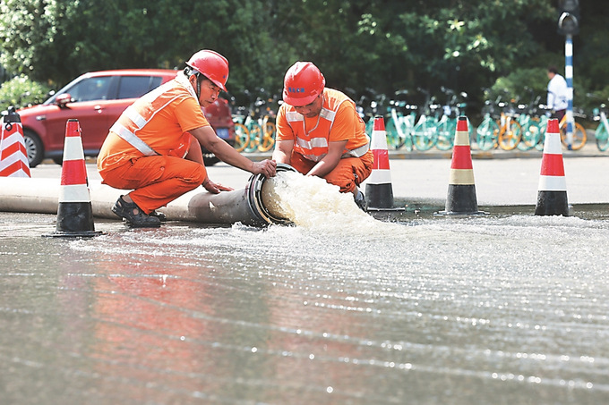 二十四日,南京市鼓樓區(qū)水務(wù)局工作人員在集賢路操作排水泵車清除積水,恢復(fù)道路正常通行。本報記者 陳儼 攝