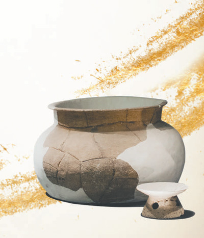 三星堆第三發(fā)掘區(qū)出土的陶高領(lǐng)甕(后)和陶鏤孔圈足盤(pán)。圖為三星堆博物館提供