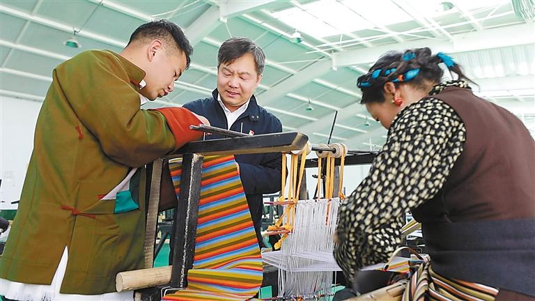 謝通門縣珠峰牛羊示范合作社內(nèi)工人正在編織氆氌。
