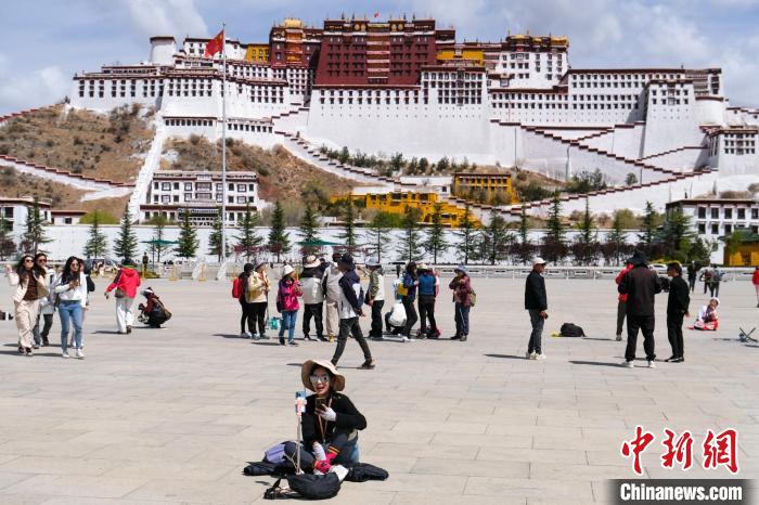 圖為4月18日,一位視頻博主在拉薩布達(dá)拉宮廣場(chǎng)直播,其身后為游客在拍照“打卡”。江飛波 攝