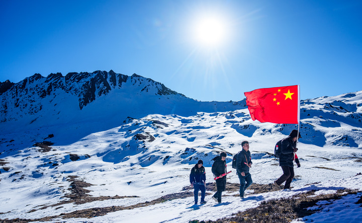 50歲的普布羅布單手舉著五星紅旗,走在隊(duì)伍最前面。索朗多吉不時(shí)用望遠(yuǎn)鏡看向更遠(yuǎn)處的雪線?!坝袥](méi)有人越過(guò)邊境,裸露的石頭上有沒(méi)有他國(guó)的標(biāo)識(shí)物……這些都是巡邊要注意的事?!彼f(shuō)。