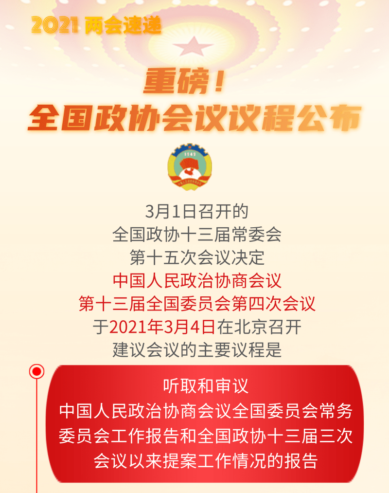 據(jù)新華社消息,3月1日召開的全國政協(xié)十三屆常委會第十五次會議決定:中國人民政治協(xié)商會議第十三屆全國委員會第四次會議于2021年3月4日在北京召開。[詳細(xì)] -