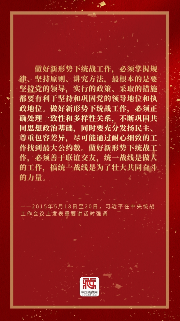 統(tǒng)一戰(zhàn)線是中國共產(chǎn)黨在中國革命中戰(zhàn)勝敵人的一個(gè)重要法寶。黨的十八大以來,以習(xí)近平同志為核心的黨中央把統(tǒng)一戰(zhàn)線和統(tǒng)戰(zhàn)工作擺在全黨工作的重要位置,努力團(tuán)結(jié)一切可以團(tuán)結(jié)的力量、調(diào)動(dòng)一切可以調(diào)動(dòng)的積極因素,畫出最大同心圓,為黨和人民事業(yè)不斷發(fā)展?fàn)I造了十分有利的條件。讓我們一起品讀習(xí)近平總書記關(guān)于統(tǒng)戰(zhàn)工作的“金句”,以此為指南,凝聚團(tuán)結(jié)奮進(jìn)力量,不斷開創(chuàng)統(tǒng)戰(zhàn)工作新局面!(中國西藏網(wǎng) 編輯/周晶 孫健 制作/歐帆)