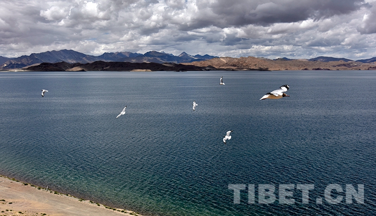 團(tuán)團(tuán)云朵懸停藍(lán)天,班公湖湖面微波蕩漾。湖岸藏野驢、黑頸鶴悠閑漫步;湖邊棕頭鷗滑翔游弋、魚翔淺底。“世界屋脊的屋脊”,人們“不負(fù)青山”,也收獲了“金山銀山”。(中國西藏網(wǎng) 記者/王媛媛)