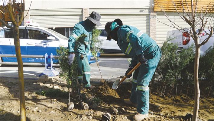 拉薩城關(guān)區(qū)潔達(dá)園林公司工作人員開(kāi)展春季市區(qū)補(bǔ)植補(bǔ)栽工作。