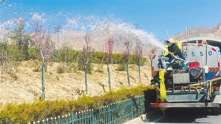 相關(guān)工作人員在為路邊樹木澆水。 記者 格桑倫珠 實(shí)習(xí)生 達(dá)娃宗巴 攝