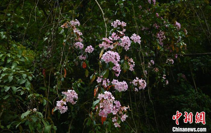 因氣候濕潤,森林里的樹上長滿了藤蔓植物、蕨類植物、苔蘚。在這里,植物從空間上獲得了最大密度的生長。開滿粉色花朵的植物從樹上倒掛而下,科考人員一眼辨認(rèn)出是大花水東哥,奈何正是花期無法采集種子。