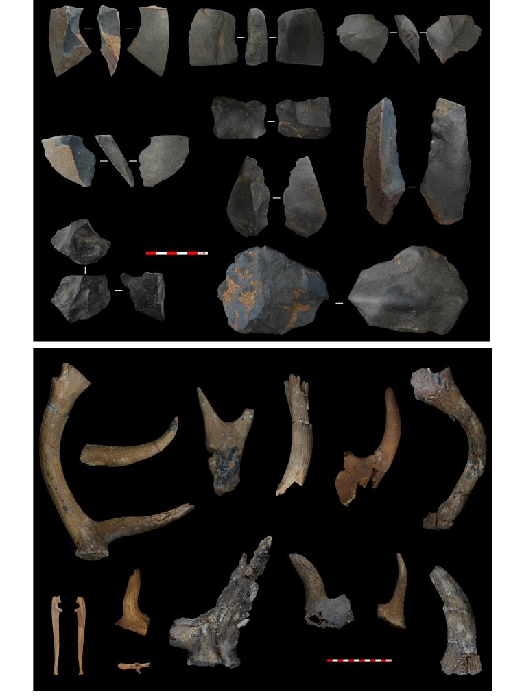 第一期遺存——石制品(上);第一期遺存——動物化石(下)。(資料圖片由中國科學(xué)院古脊椎動物與古人類研究所提供)