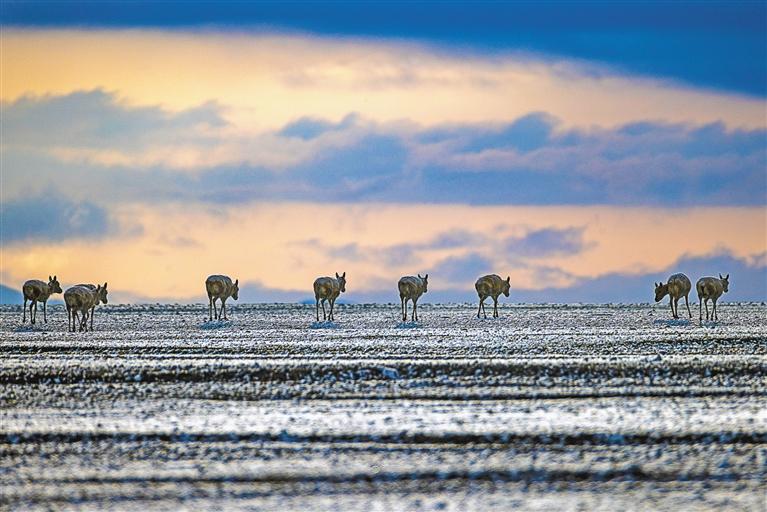 6月13日傍晚,在羌塘國家級(jí)自然保護(hù)區(qū),一群藏羚羊在遷徙。新華社記者 費(fèi)茂華 攝