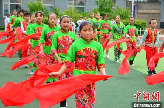 圖為化隆縣第一小學(xué)的學(xué)生們正在跳《民族大團(tuán)結(jié)》(左前一是李貴蘭)?!◆?shù)り?攝