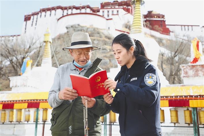 圖為西藏出入境邊防檢查總站執(zhí)法調查支隊民警在宗角祿康公園向過往群眾宣傳憲法知識。仁青旺堆 張一鳴 攝