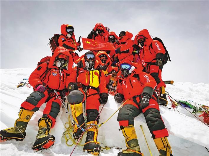 5月27日,2020珠峰高程測量登山隊(duì)成功登頂世界第一高峰珠穆朗瑪峰。他們在峰頂豎立覘標(biāo),安裝GNSS天線,開展各項(xiàng)峰頂測量工作。45年前的這一天,中國人首次將覘標(biāo)帶至珠峰峰頂。新華社特約記者 扎西次仁 攝