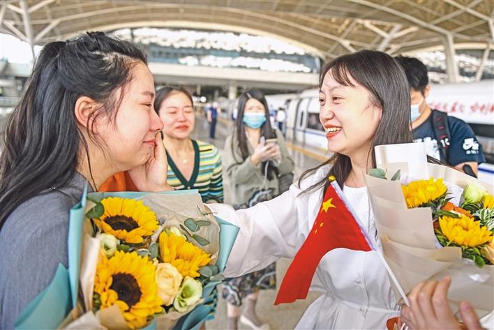 10月1日,一批馳援過武漢抗疫的江蘇醫(yī)療隊(duì)隊(duì)員重回武漢,曾經(jīng)并肩戰(zhàn)斗的江蘇援鄂醫(yī)療隊(duì)員吳衛(wèi)娟(右)和武漢市江夏中醫(yī)院的董璇(左)再度相逢,喜極而泣。新華社記者 程敏 攝