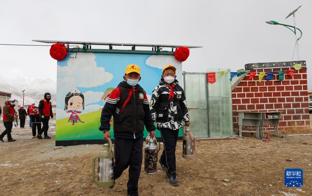 3月21日,那曲市色尼區(qū)香茂鄉(xiāng)小學(xué)的同學(xué)們?cè)谛聠⒂玫膬羲敬蛩?。新華社記者 姜帆 攝