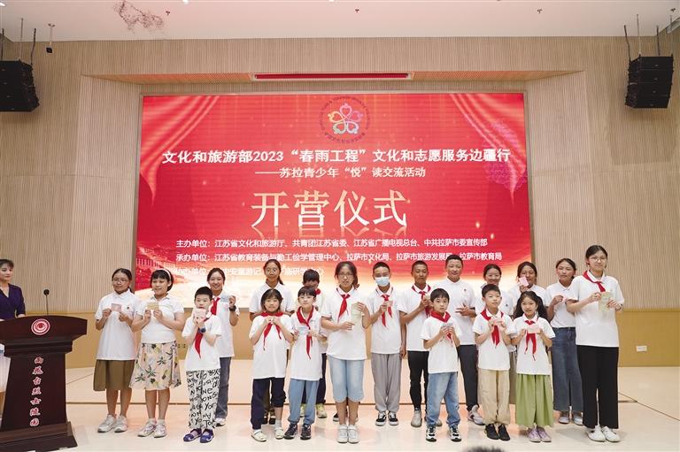 儀式上,江蘇和拉薩兩地青少年圍繞“中華民族一家親,同心共筑中國夢”主題開展了互助結(jié)對(duì)儀式和“春雨工程”授旗儀式,范躍平和陳兵共同將文旅部“春雨工程”項(xiàng)目旗幟授給本次活動(dòng)項(xiàng)目領(lǐng)隊(duì)、拉薩市圖書館館長朱純琳。