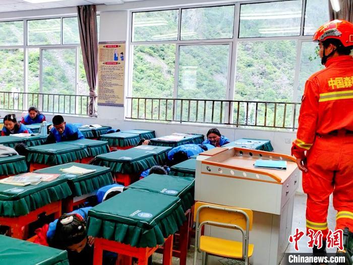 同學(xué)們在消防員的指導(dǎo)下進(jìn)行地震避險(xiǎn)演練。李國燾 攝