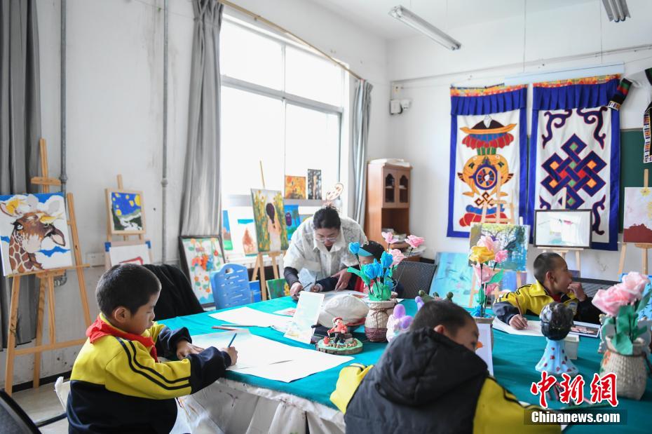 圖為那曲市特殊教育學(xué)校老師教學(xué)生畫畫。貢嘎來松 攝