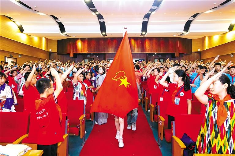 圖為夏令營主題隊會上,全體少先隊員向隊旗敬禮,齊唱《中國少年先鋒隊隊歌》。