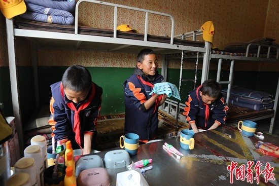 9月14日,西藏那曲市班戈縣第二(中石化)小學(xué),學(xué)生們午休后在宿舍里洗漱。部分離家較遠的學(xué)生,可以選擇讀書期間全程住校,生活起居都有專門的老師照顧。中青報·中青網(wǎng)記者 孔斯琪 攝