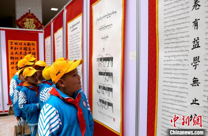 圖為小學(xué)生在圖書(shū)館大廳,參觀“傳承與創(chuàng)意”第五屆書(shū)法作品展。李林 攝