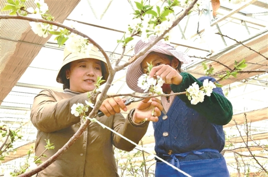 一條條有機(jī)基質(zhì)槽均勻分布,一座座日光溫室拔地而起。4月是車?yán)遄訕溟_花的時(shí)節(jié),走進(jìn)位于烏米組的車?yán)遄臃N植大棚,就能看到車?yán)遄踊ǜ傁嗑`放,一簇簇白色的花朵開滿枝頭,在綠葉和枝干的映襯下,格外賞心悅目。置身于一片花海的當(dāng)?shù)貏?wù)工人員正搶抓農(nóng)時(shí),為果樹疏剪花枝、人工授粉,大家各司其職、分工合作,一派熱火朝天的勞動(dòng)場景。