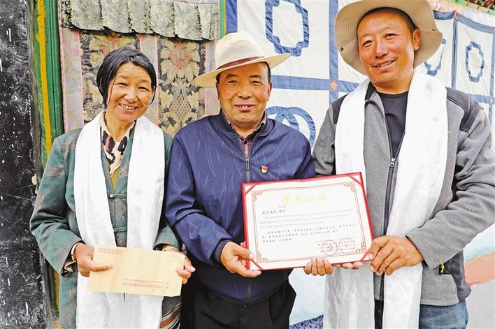 那嘎村黨委書記嘎瑪扎西(中)為脫貧戶次仁達瓦一家頒發(fā)榮譽證書。