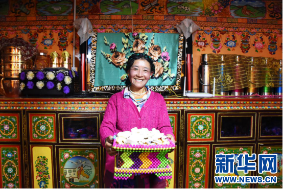 崗巴縣群眾端著糖果盒迎接遠(yuǎn)到的客人(9月15日攝)。新華網(wǎng) 張宸 攝