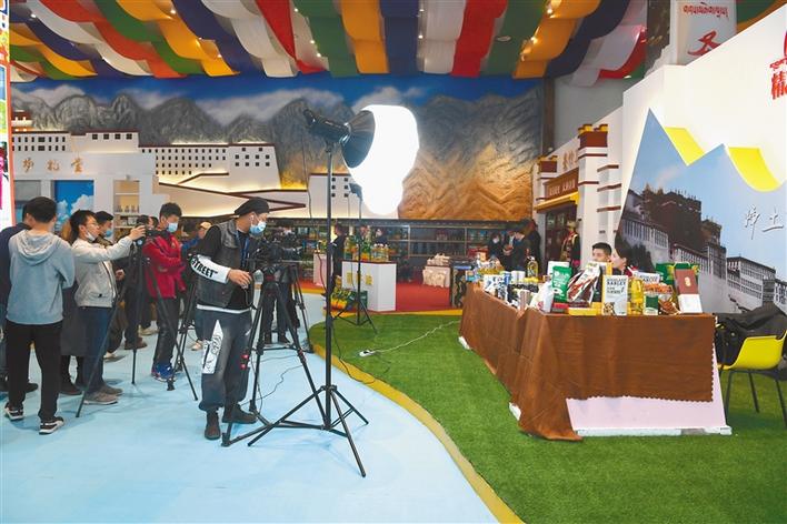 參展商家通過(guò)網(wǎng)絡(luò)直播介紹、銷售產(chǎn)品。記者 李洲 次仁平措 攝