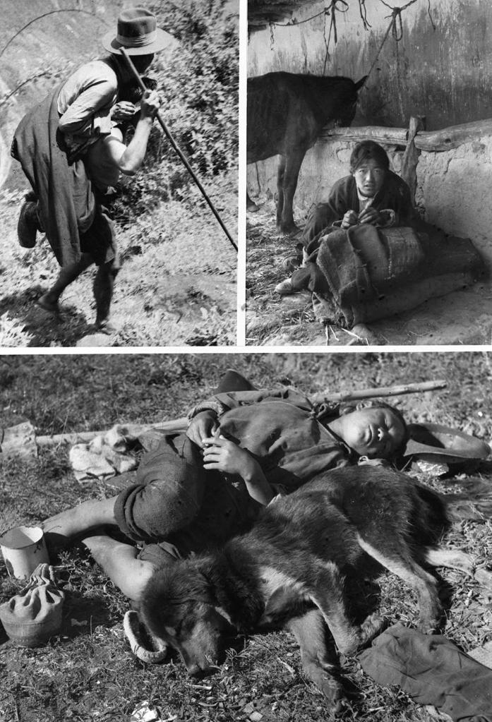 上圖左:西藏農(nóng)奴制度下的“人背人”(即農(nóng)奴像牲畜一樣背馱著農(nóng)奴主)差役。上圖右:和牲口同住的農(nóng)奴。下圖:農(nóng)奴服勞役后與犬同眠(資料照片)。