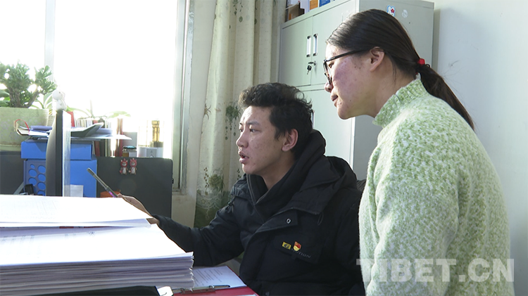圖為江達縣委組織部副部長劉成明與同事討論工作