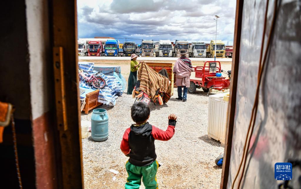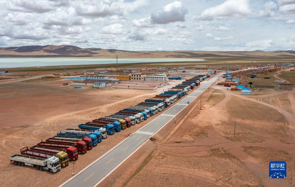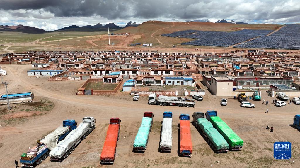 在雙湖縣多瑪鄉(xiāng)仲魯瑪村,運(yùn)輸家具的貨車整裝待發(fā)(7月13日攝,無人機(jī)照片)。新華社記者 晉美多吉 攝