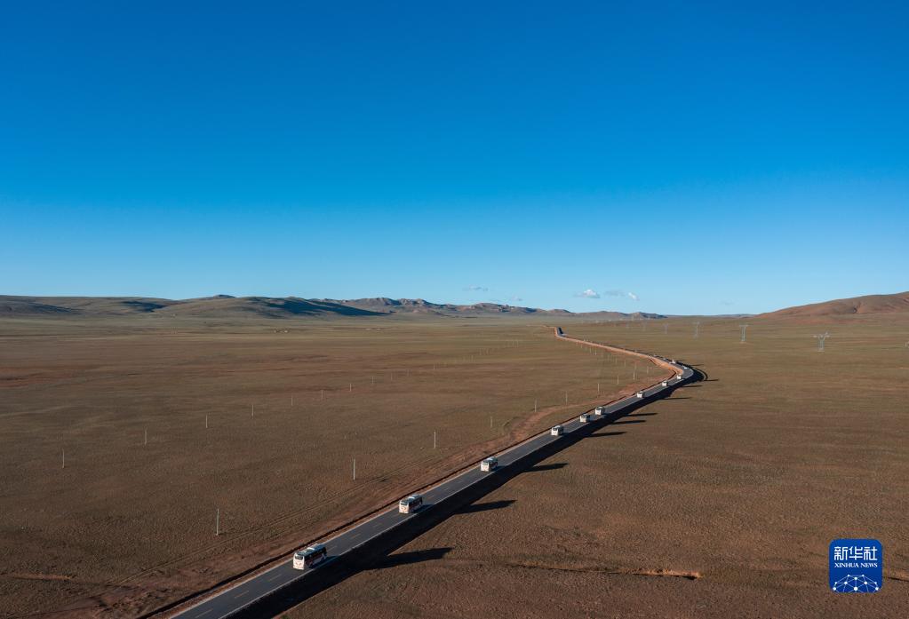 從雙湖縣出發(fā)的車隊行駛在前往森布日安置點的道路上(7月19日攝,無人機(jī)照片)。新華社記者 孫非 攝