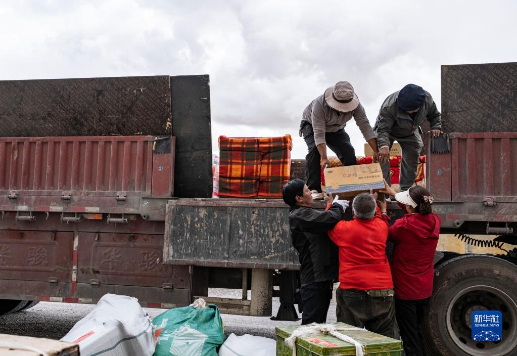 雙湖縣多瑪鄉(xiāng)果根擦曲村村民將行李搬上貨車(7月12日攝)。新華社記者 孫非 攝