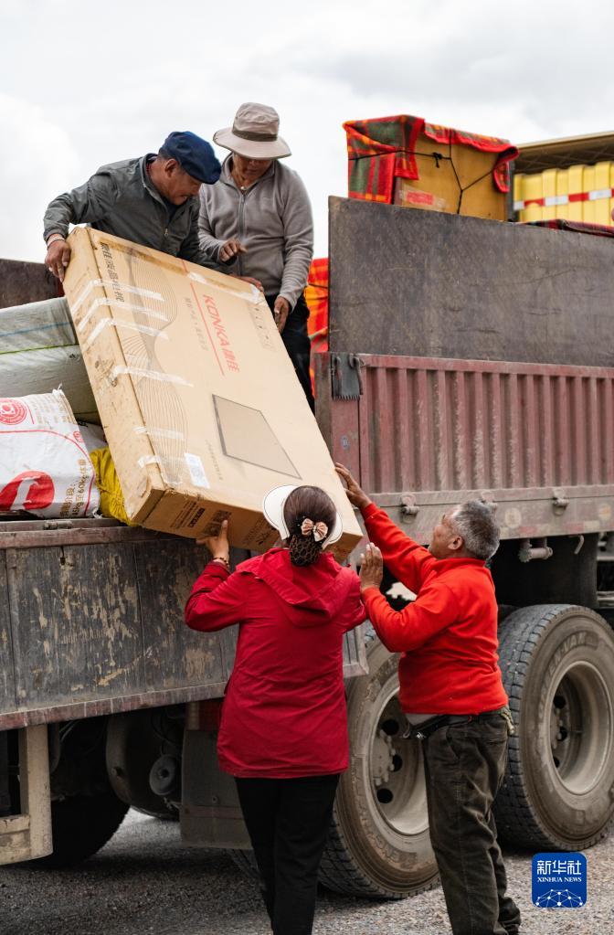 雙湖縣多瑪鄉(xiāng)果根擦曲村的村民將家具裝車,準(zhǔn)備搬遷(7月12日攝)。新華社記者 周荻瀟 攝