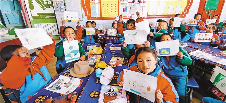 圖為那曲市小朋友展示他們參加“鄉(xiāng)村振興 那曲奮進(jìn)”活動的作品。那曲采訪組 攝