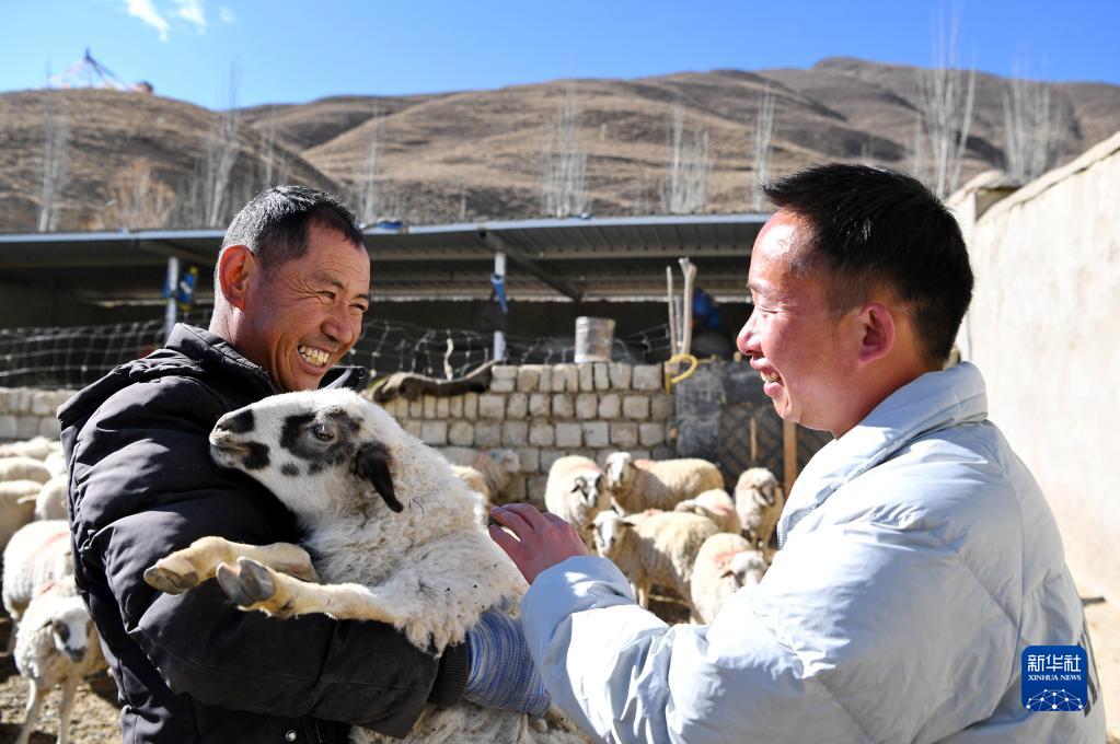 西卡學(xué)村養(yǎng)殖合作社負(fù)責(zé)人邊覺(jué)(左)在向西卡學(xué)村黨總支第一書記兼駐村工作隊(duì)副隊(duì)長(zhǎng)李德林介紹綿羊養(yǎng)殖及銷售情況(4月5日攝)。新華社記者 張汝鋒 攝