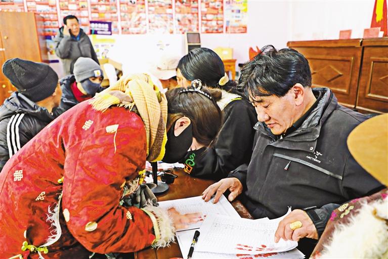 圖為圓夢(mèng)新居社區(qū)群眾有序排隊(duì)、簽字、按手印,準(zhǔn)備領(lǐng)取分紅。 記者 達(dá)珍 永青 攝