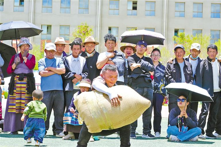 圖為桑珠孜區(qū)城北街道舉辦慶祝第八個“日喀則市民族團結進步日”暨“全民來健身 健康你我他”社區(qū)運動會。這是參賽選手在進行抱石頭比賽。