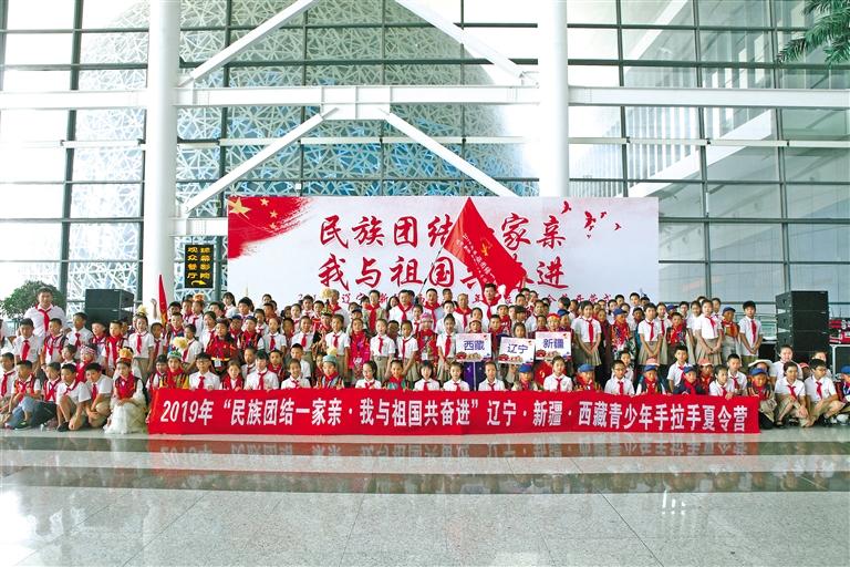 2019年“民族團結(jié)一家親·我與祖國共奮進”遼寧·新疆·西藏青少年手拉手夏令營開營儀式現(xiàn)場。