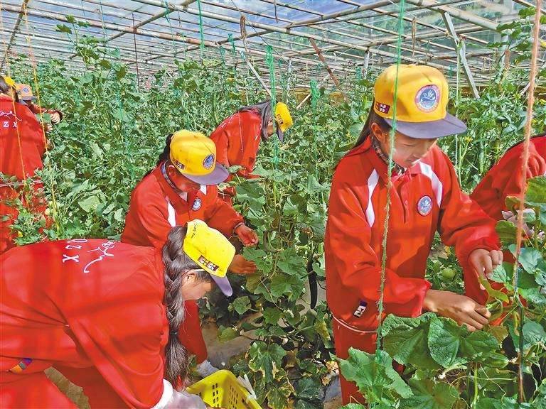 鞍山市援建的巴青縣中學(xué)勤工儉學(xué)實踐基地內(nèi),學(xué)生在采摘。