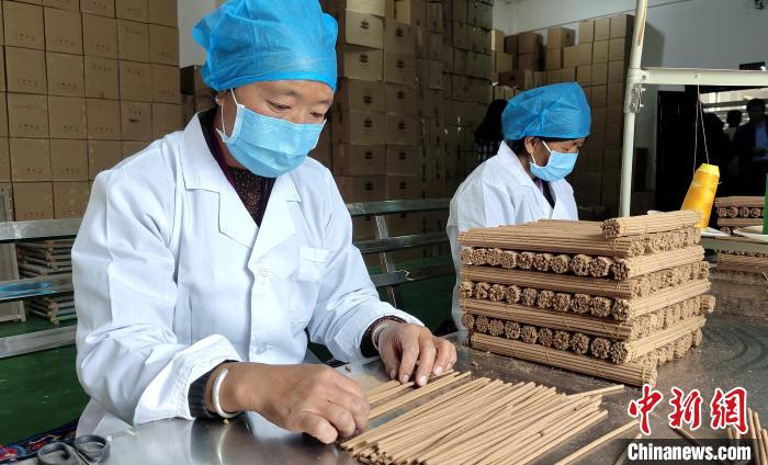 “我們農閑時就會來這里制作藏香?!睅孜宦耦^工作的婦女不善言談,但她們數(shù)線香、捆藏香流程十分嫻熟,她們足不出村實現(xiàn)就業(yè)增收?! ?/p>