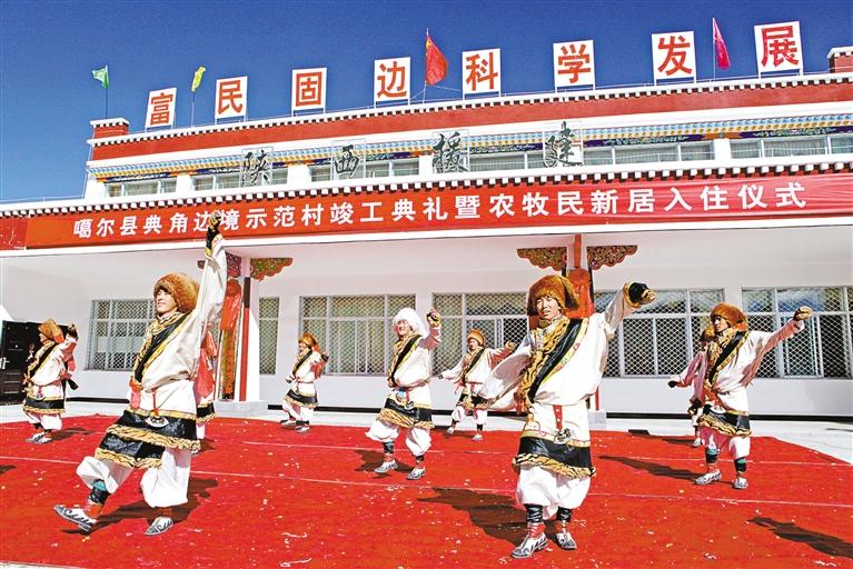 2012年10月,由陜西省援建的阿里地區(qū)首個(gè)邊境小康示范村——噶爾縣扎西崗鄉(xiāng)典角村竣工。這是入住儀式上,群眾跳起歡快的舞蹈。